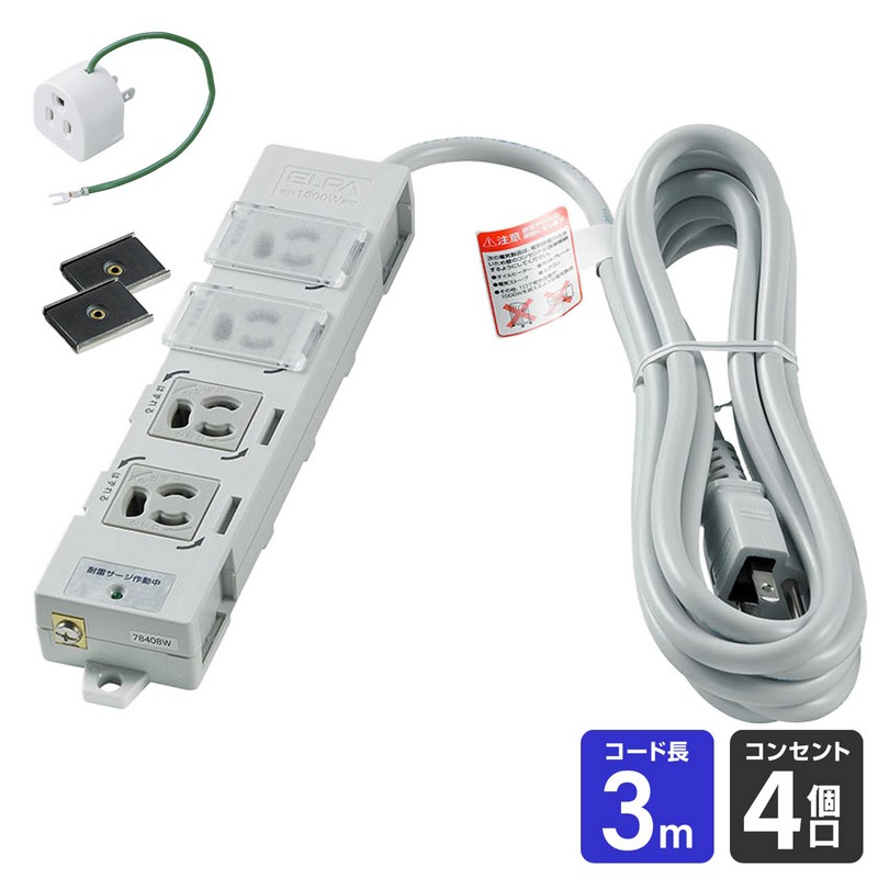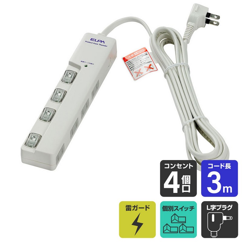 【セール】エルパ(ELPA) 電源タップ 個別スイッチ 上差し AC 4個口 コード長 2m 雷ガード 安全ブレーカー WLS-LU420SB(W)