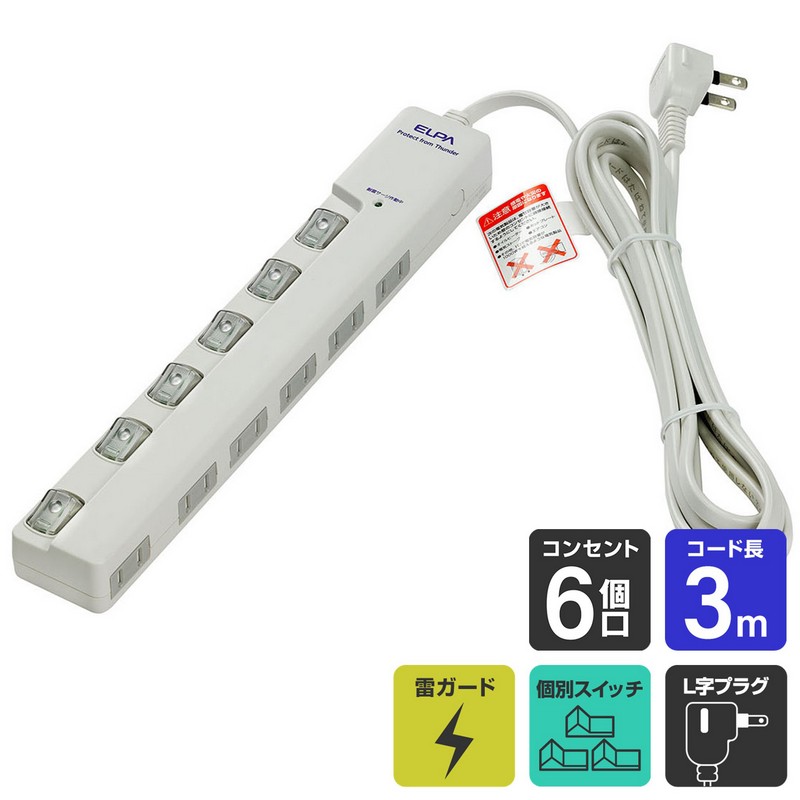 【セール】エルパ(ELPA) 電源タップ 個別スイッチ 上挿し AC 3個口 コード長 3m 雷ガード WBS-LU303B(W)