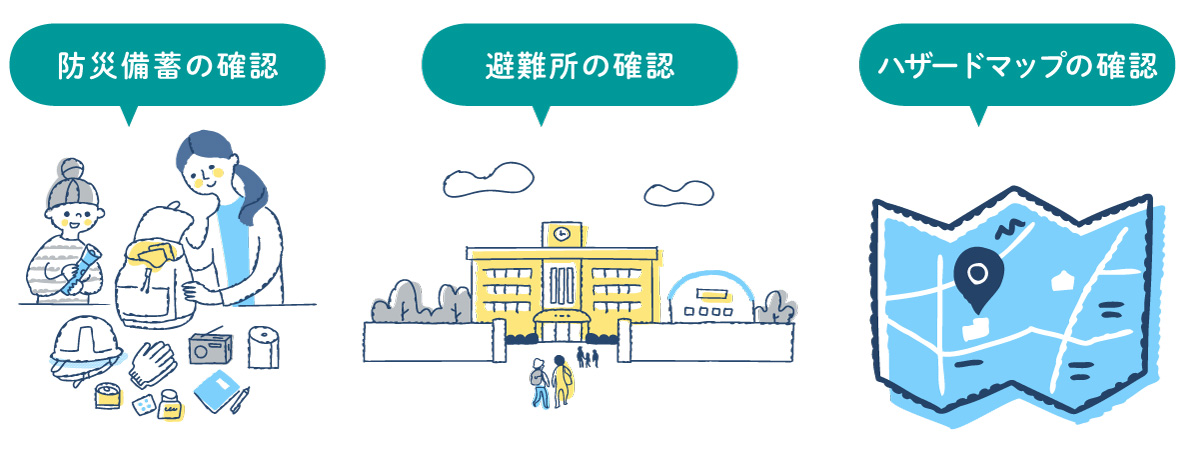 ご自宅の防災を見直し、ハザードマップや避難所の場所なども確認しておくようにしましょう。