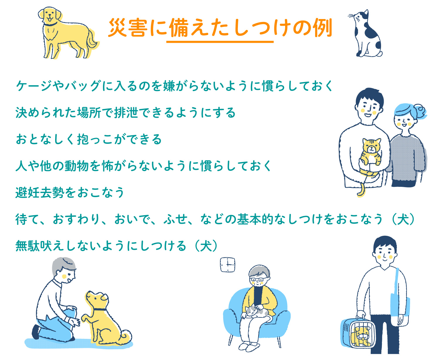 また、避難所で他人の迷惑にならないよう、また避難生活でペット自身のストレスが軽減されるよう、日頃からしつけをしておきましょう。
